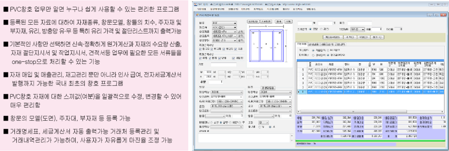 PVC 및 시스템 종합 창호프로그램은 모든 창문에 대해 자재종류, 창문모델, 창틀의 치수와 원자재, 부자재, 보강재, 유리, 방충망 등의 기본적인 요소만 선택해 주면 절단리스트는 물론 필요한 모든 소요자재의 수량과 자재원가계산까지 정확하게 산출할 수 있는 기능을 가지고 있다.